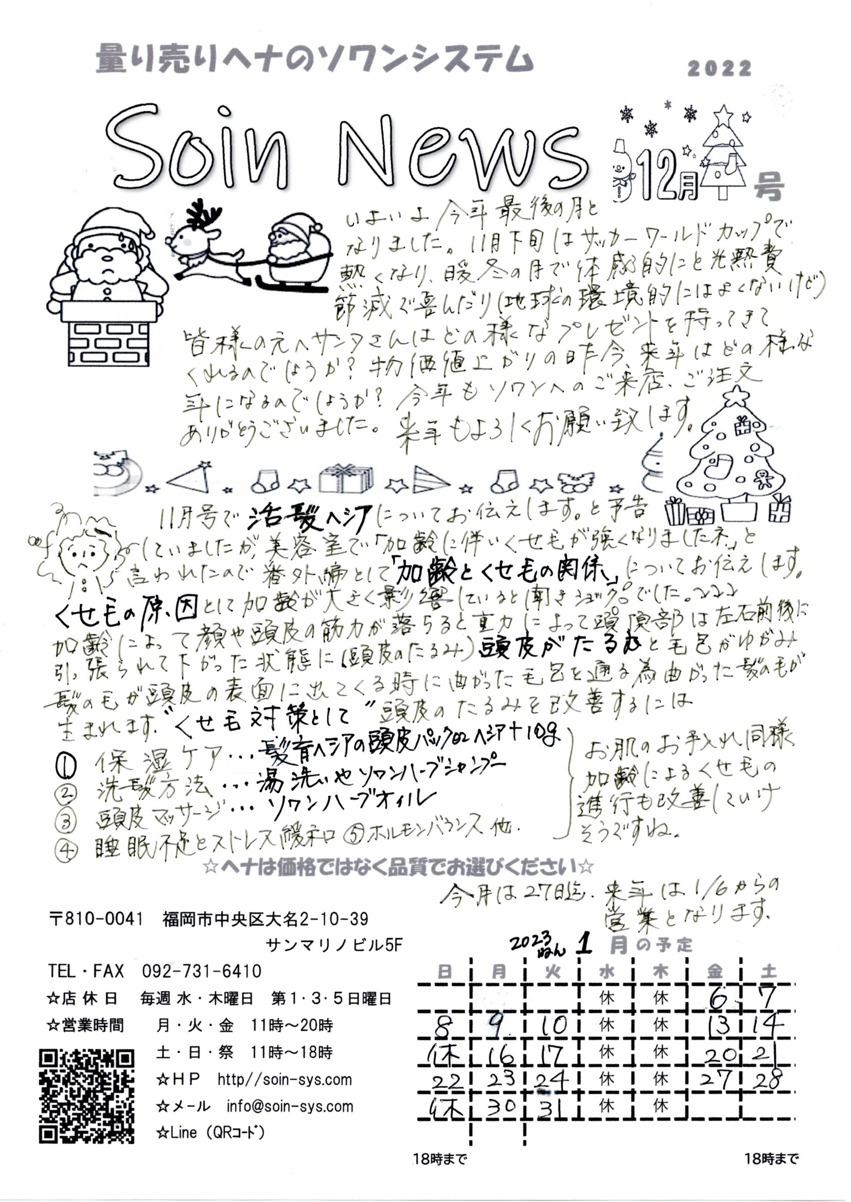今年最後のソワンニュースとなりました。 今月号はヘナとくせ毛の関係性。くせ毛はヘナを続けることで少しずつでも緩和されます。