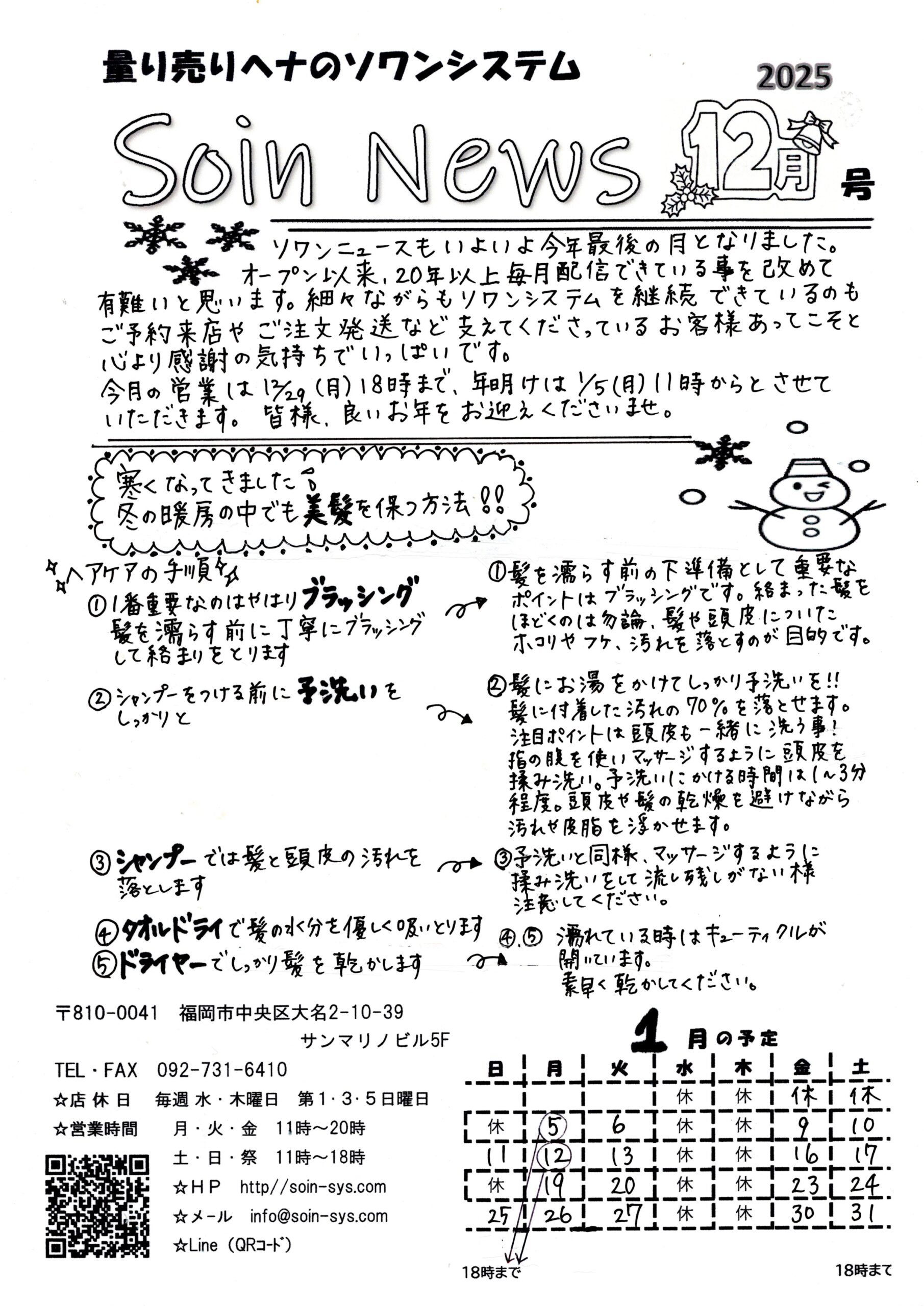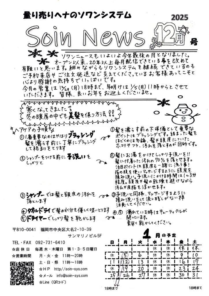 Soin News 12月号です。 今月は冬の乾燥から髪の毛を守る毎日のケア法をご紹介しています。 是非お試しください。